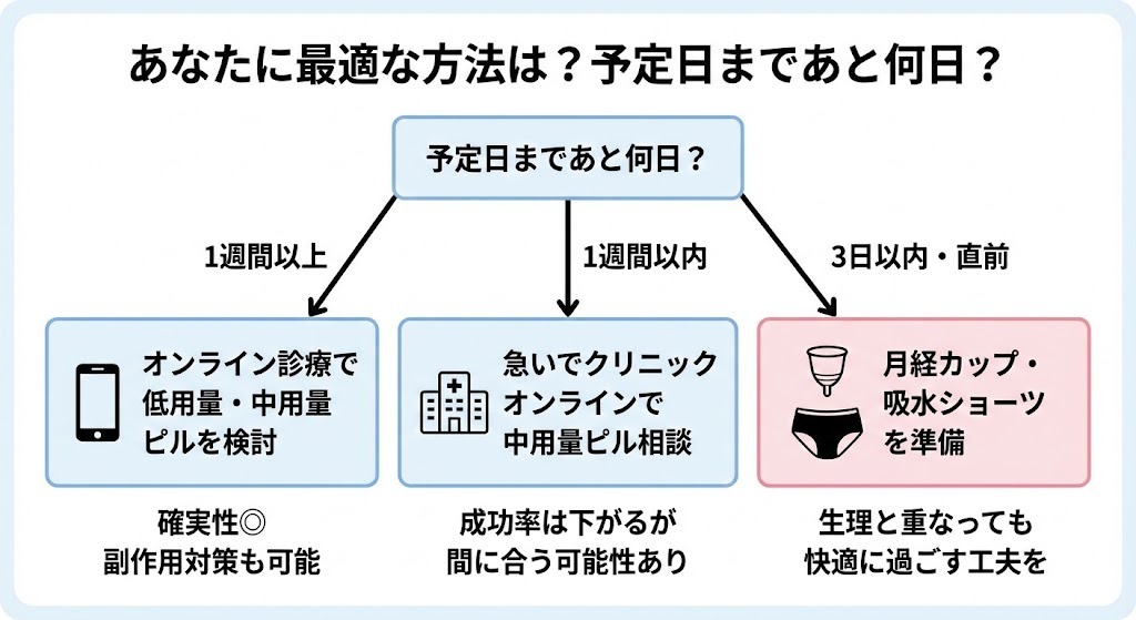A. 3 日前だと、残念ながらピルで遅らせるのも成功率が著しく下がります。ピルは遅くとも予定日の 5 日〜1 週間前から飲み始める必要があるためです。