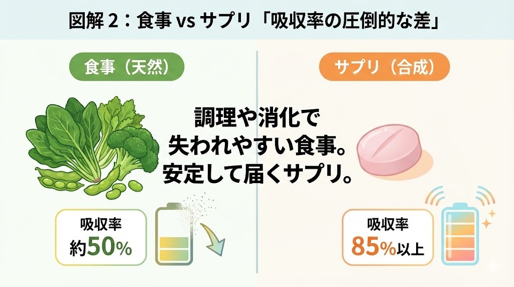 一方、サプリメントの葉酸(モノグルタミン酸型)は利用効率が約85%以上と高く、安定して必要量を確保できます。